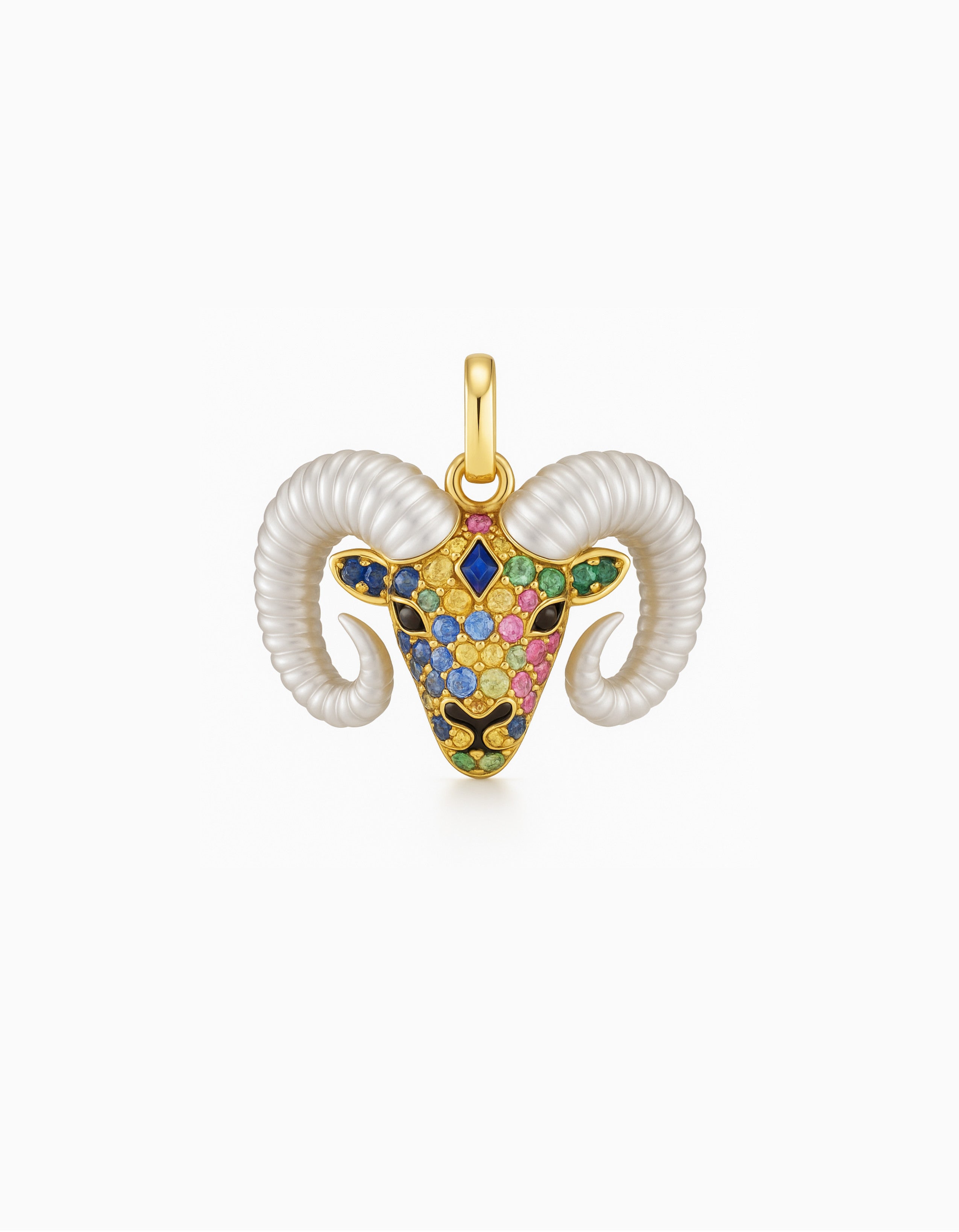 A striking tribute to the fiery Aries spirit, this pendant is meticulously crafted from 18k yellow gold and adorned with a vibrant array of gemstones. A powerful and luxurious statement for those born under the Aries sign.