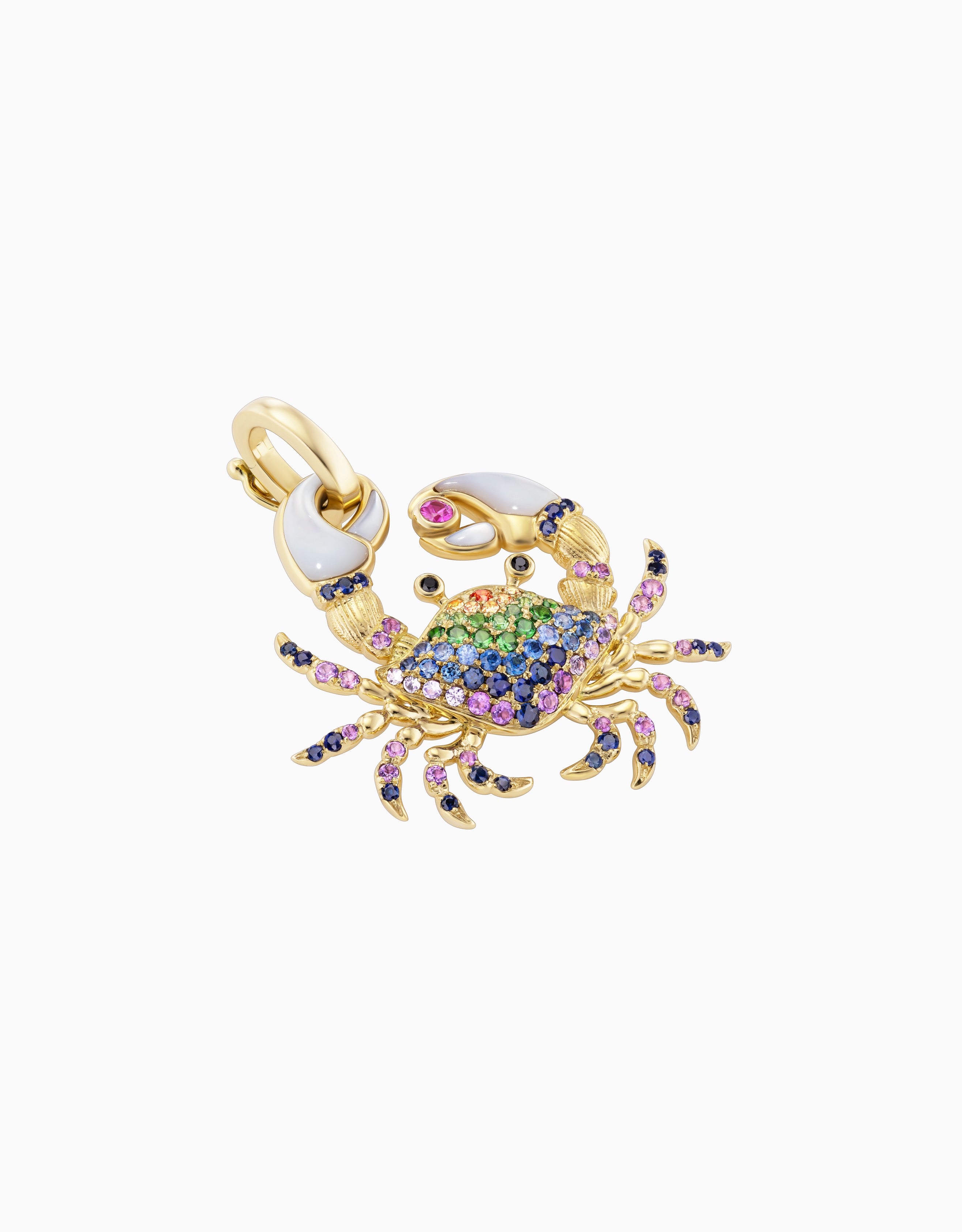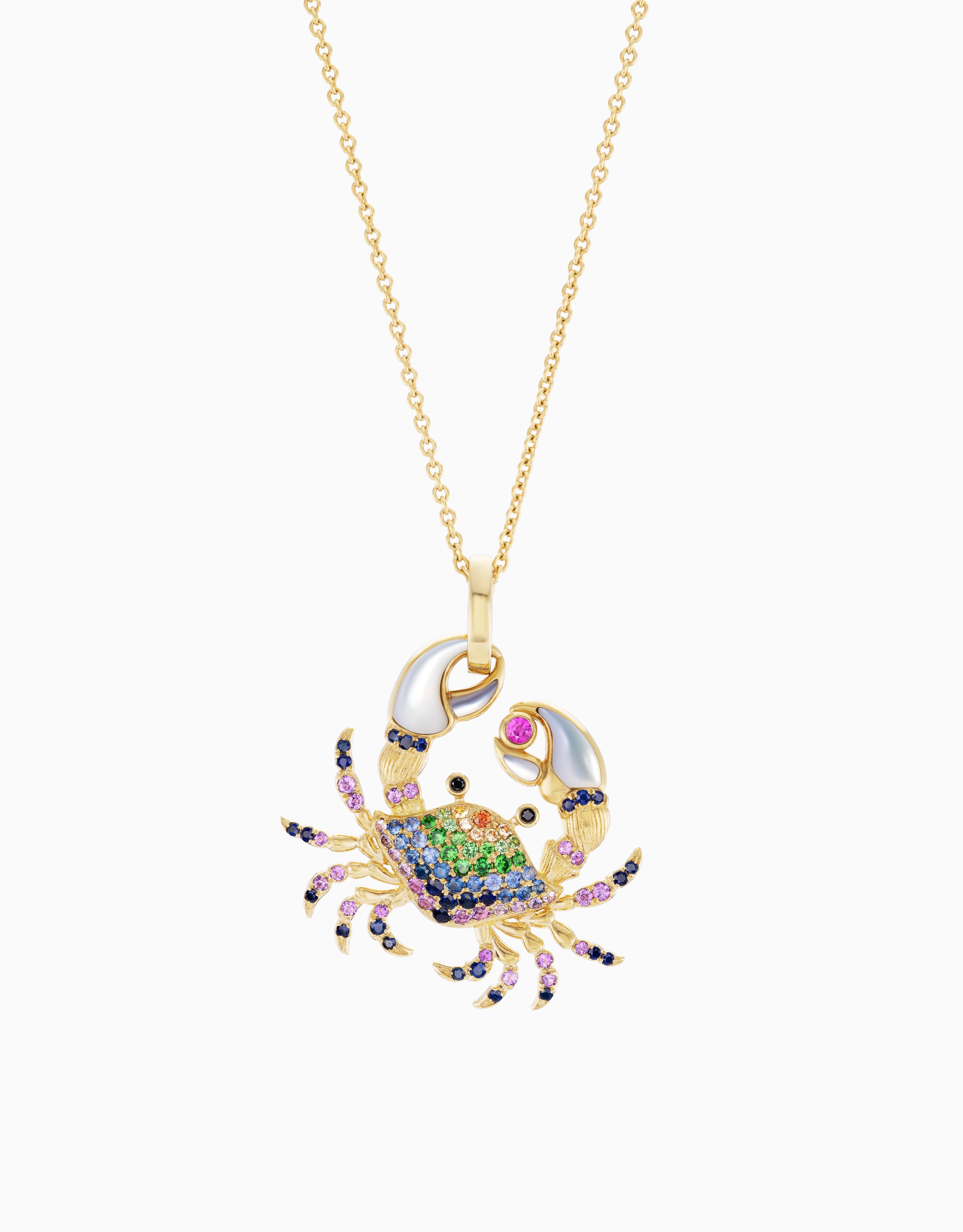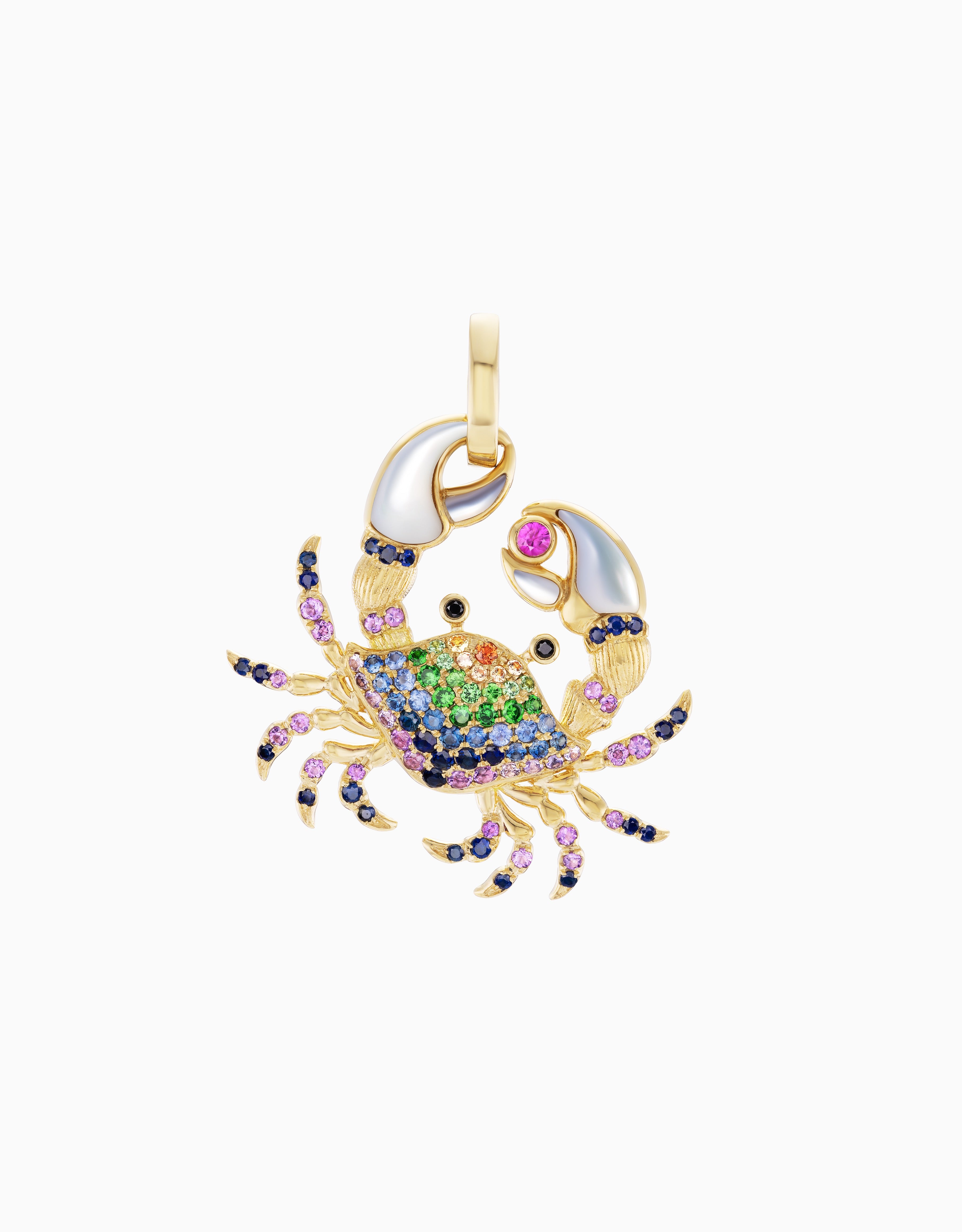 Emotive and intuitive, this Cancer pendant embodies the deep sensitivity and nurturing spirit of the zodiac’s water sign. Crafted in 18k yellow gold, it features amethyst, diamond and colorful gemstones. Soft yet powerful, this piece reflects Cancer’s protective nature and profound emotional depth with elegance.
