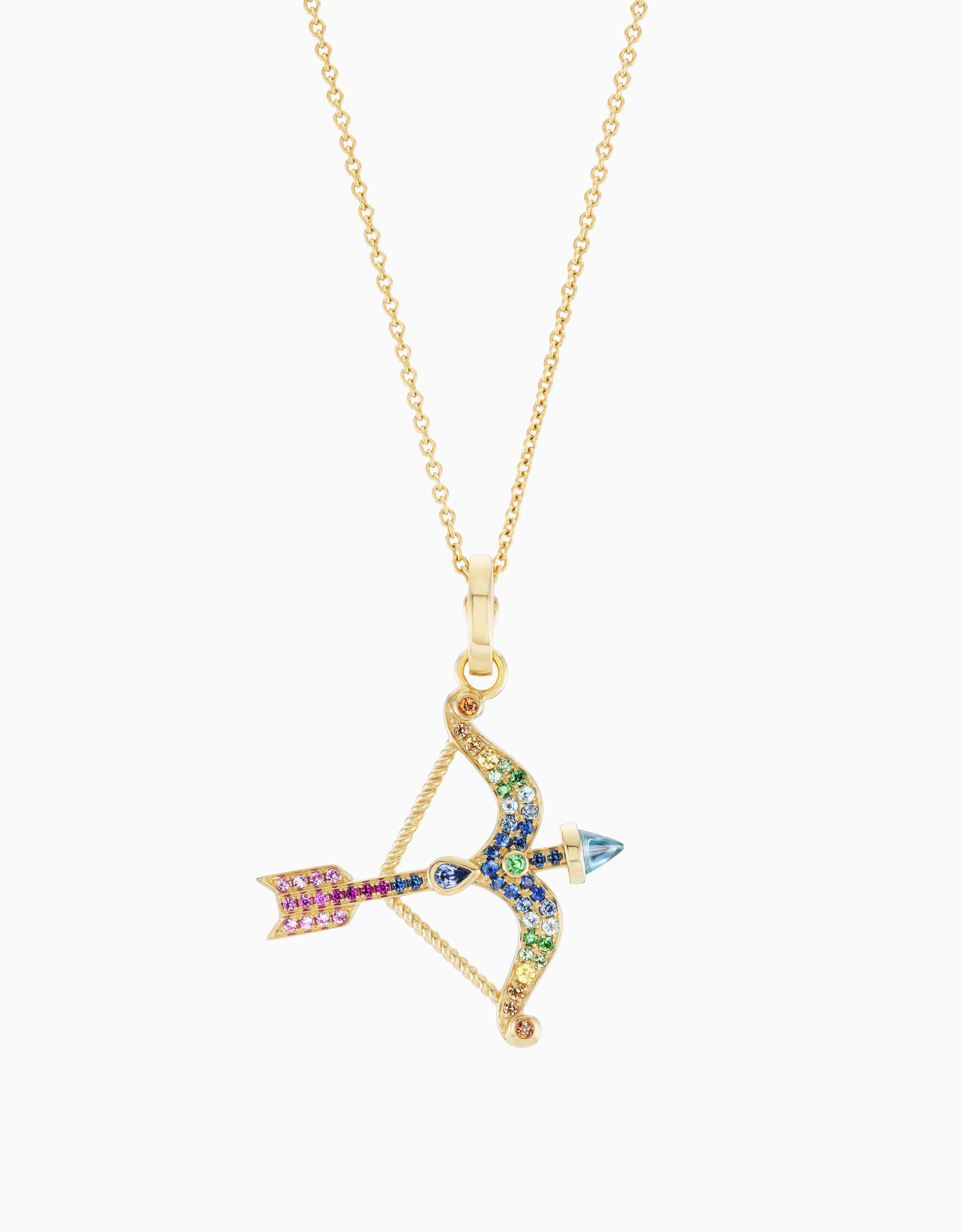 Bold and free-spirited, this Sagittarius pendant captures the adventurous essence of the zodiac’s explorer. Crafted in 18k yellow gold, it features ruby, tsavorite, topaz, and sapphire. With its vibrant colors and dynamic design, it reflects Sagittarius’s passion for truth, travel, and boundless possibilities.
