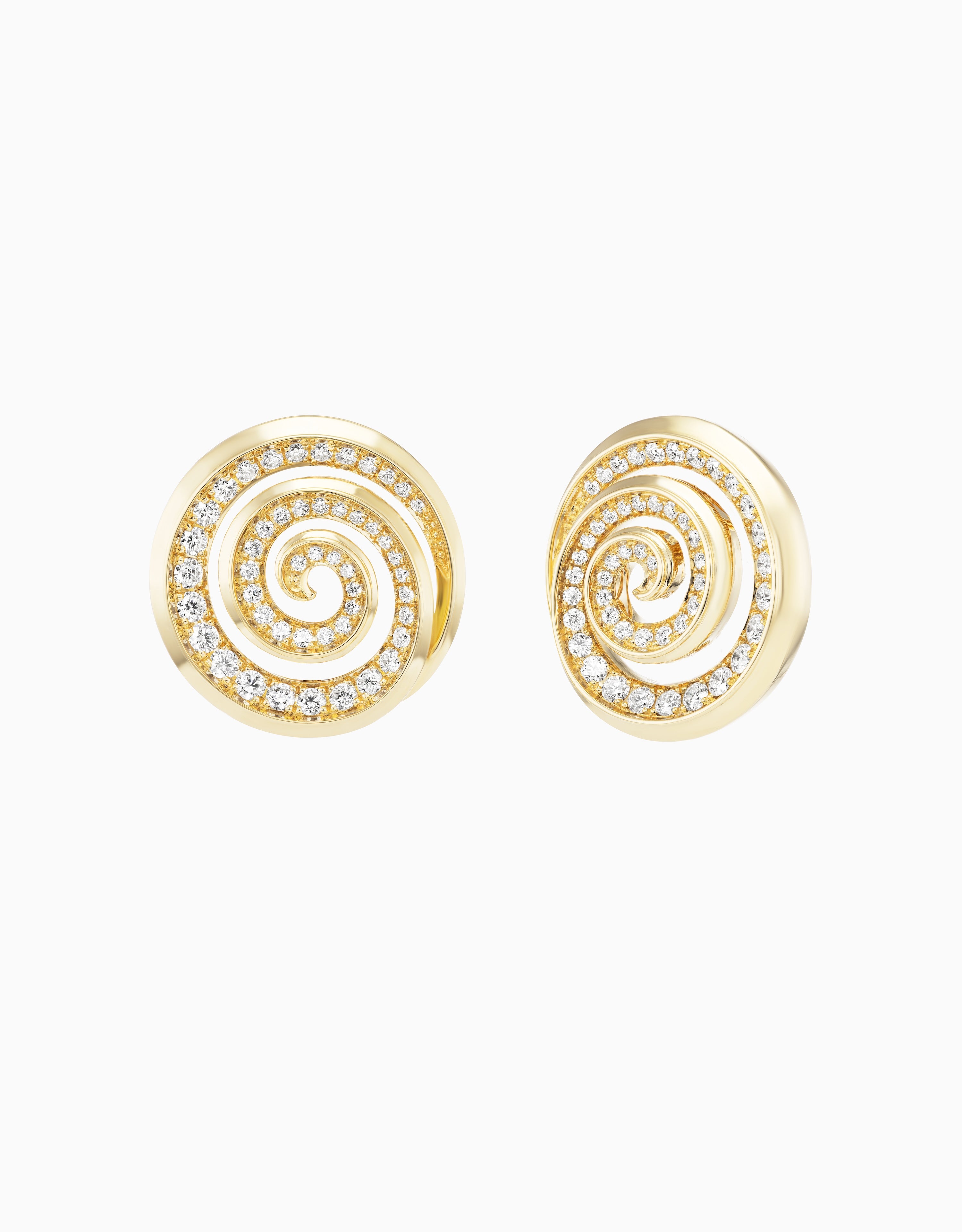 A refined take on the swirling geometry of tie-dye, these 18k yellow gold earrings feature a spiral set with brilliant white diamonds. The design captures the visual rhythm of a twist in motion—clean, symmetrical, and radiant. Pavé-set diamonds trace the curves of each coil, creating a continuous line of light that draws the eye inward. Thoughtfully engineered, the post folds down to allow the earrings to be worn as clip-ons, offering versatility without compromising design. Compact yet dimensional, these studs bring sculptural elegance to everyday wear.